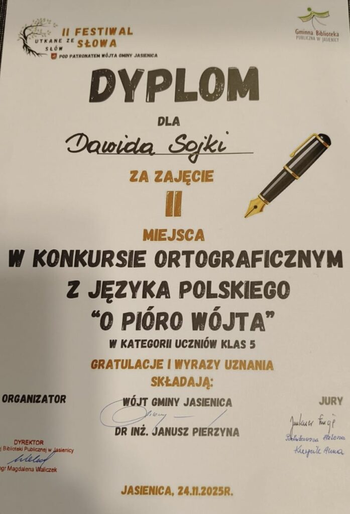Dnia 24 listopada 2025 roku odbył się Konkurs Ortograficzny – „O Pióro Wójta” dla uczniów klas 5. W konkursie wzięło udział 14 uczniów za szkół podstawowych Gminy Jasienica. Całe wydarzenie miało miejsce w Gminnej Bibliotece Publicznej. Konkurs przyjął formę dyktanda.