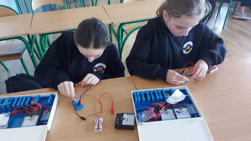 W ramach projektu „LABORATORIA PRZYSZŁOŚCI” uczniowie klasy szóstej poznali podstawy elektrotechniki, sposoby połączeń obwodów elektrycznych, elementy (nazwy i symbole) wchodzące w skład obwodów. Potrafią budować obwody według schematów, dokonywać pomiarów używając mierników. Na tych zajęciach wykorzystano otrzymane zestawy do elektrotechniki. Uczniowie zapoznali się z elektroskopem i sami zbudowali swój domowy elektroskop. Potrafią wykrywać ładunki elektryczne i elektryzować różne materiały.